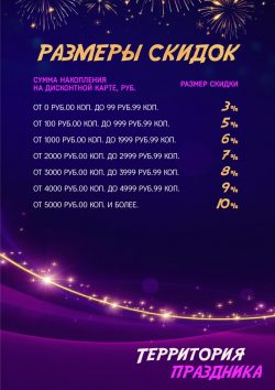- Накопительные дисконтные карты действуют в магазинах «Территория Праздника».
